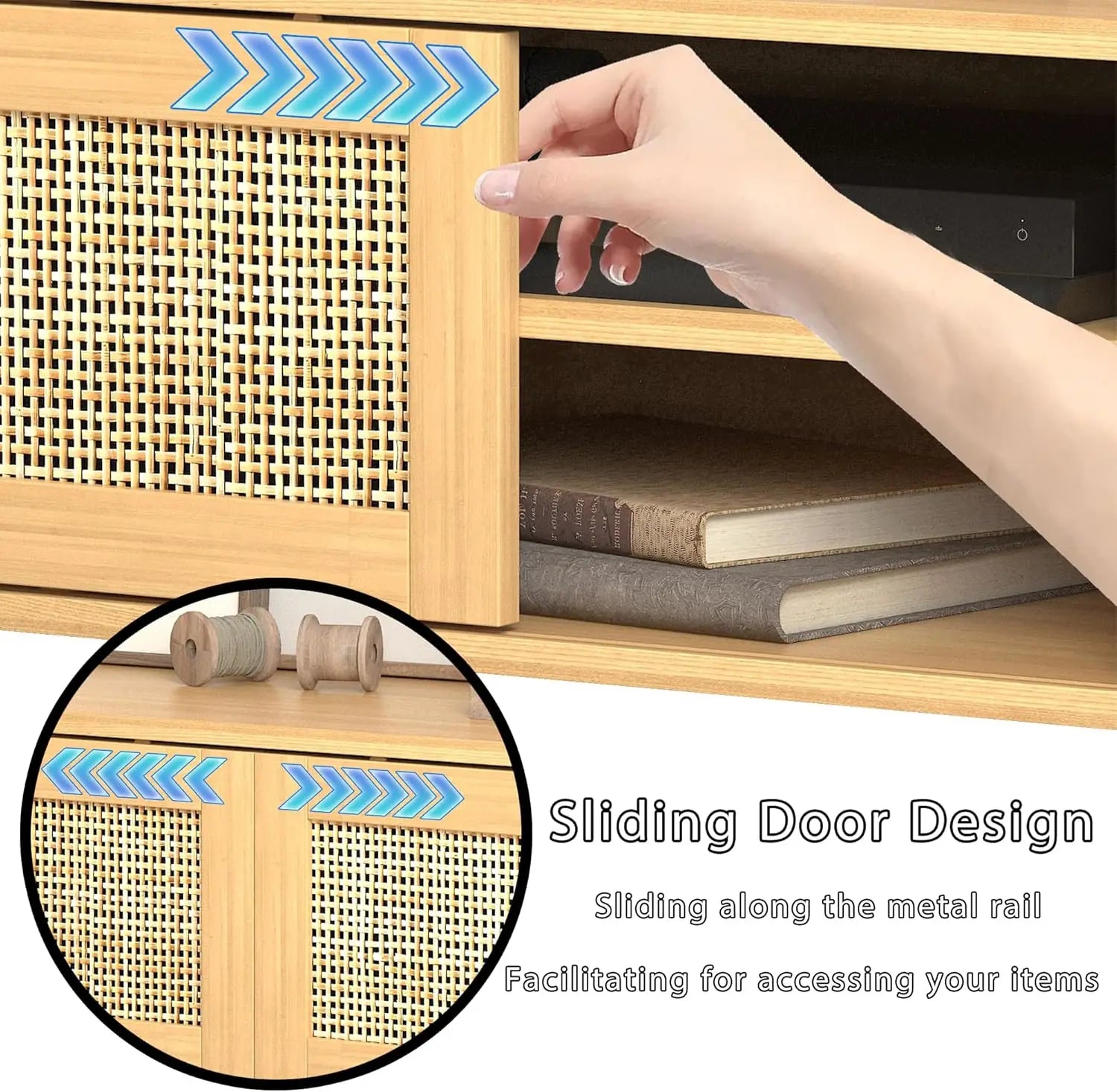 Boho TV Stand for 55 to 65 Inch TV Rattan Entertainment Center with Shelves Cabinets and Sliding Doors TV Media Console Table with Solid Wood Feet and Cord Holes for Living Room Bedroom Natural