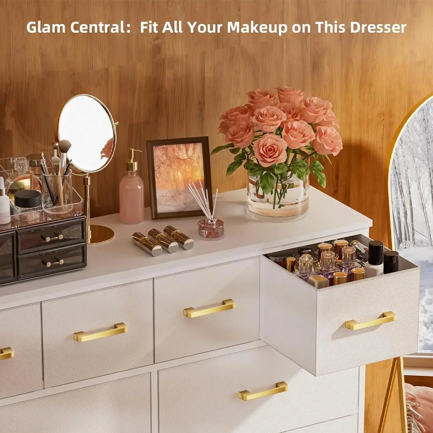 - 🏆Durable Material: Made of strong steel frame and thick p2 class wooden top, this white dresser offers stable support and ensures years of use. the "double X" support bar is designed on the back to provide strong stability and bearing capacity for the large dresser. Non-woven fabric with faux leather front drawers are easy to clean and open and close quitely. All in all, this dresser it's a reliable part of your bedroom furniture.
